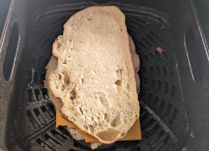 When the air fryer is preheated, set the time to 10 minutes and place the sandwich inside