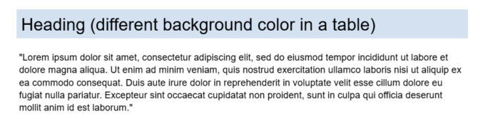 All of these styles, except the one with the different background color, look fine, but they may not suffice if you want high-contrasting section headings. You can put heading text in a 1×1 table, as shown below, but that’s not ideal, especially if your document may be parsed.