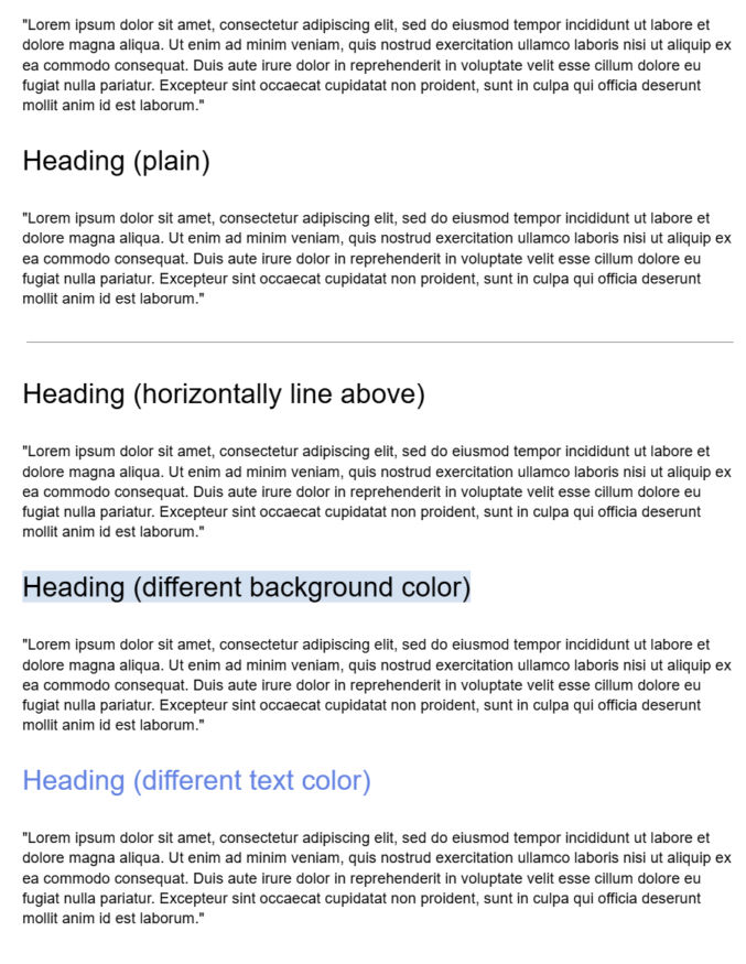 Document headings (Heading 1, Heading 2, …) are useful to show a document’s content hierarchy. But, unless styled, it can still be difficult to visually scan a document to quickly find different sections. Some techniques to add styling and improve visual hierarchy include