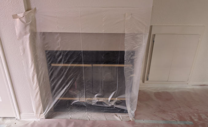 For the floor, I use red rosin paper taped to the top of the baseboard and I’ll use a plastic and fabric drop cloth for the middle of the floor.