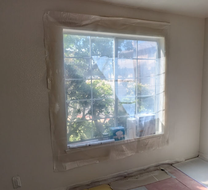 For windows, I like to staple somewhat thick (3.5 mm) transparent plastic. If it’s too thin, it’s harder to cut, it easily blows away, and it’s hard to secure to a surface. Also, stapling is much quicker and easier than taping all sides. The transparent plastic lets light in so you can see what you’re painting. Since the air pressure from spray painting can blow paint particles everywhere, I like to use a healthy margin around any objects I’m masking so that even if paint manages to get under the plastic, it won’t go far and reach the surface I don’t want painted.
