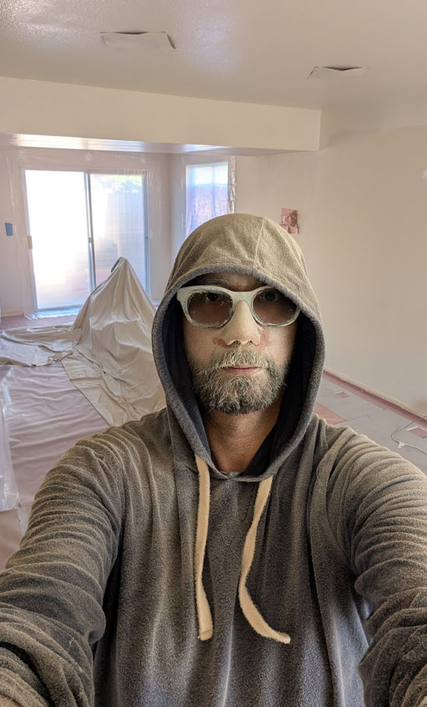 When spray painting, paint particles can go everywhere. You can buy and wear a painter’s coverall, but they are very uncomfortable. Instead, I recommend wearing sacrificial clothing that you don’t mind getting paint on. I wear a long-sleeve shirt with a hoodie so I can cover my arms and hair, leaving only my hands and face exposed to paint particles. If you wear glasses, I also recommend wearing old glasses that you don’t mind getting paint on.
