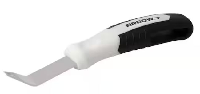 When removing plastic or red rosin paper that was stapled to a surface, I recommend using a staple puller. It makes removing staples and nails much easier than using other methods.