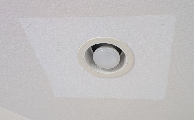 For ceiling lights, I like to staple heavyweight red rosin paper over them, as shown below. Taping is not necessary as long as the paper is large enough to prevent paint particles from reaching the lights from the gaps along the edges. Cutting rosin paper is easy using scissors or a utility knife.