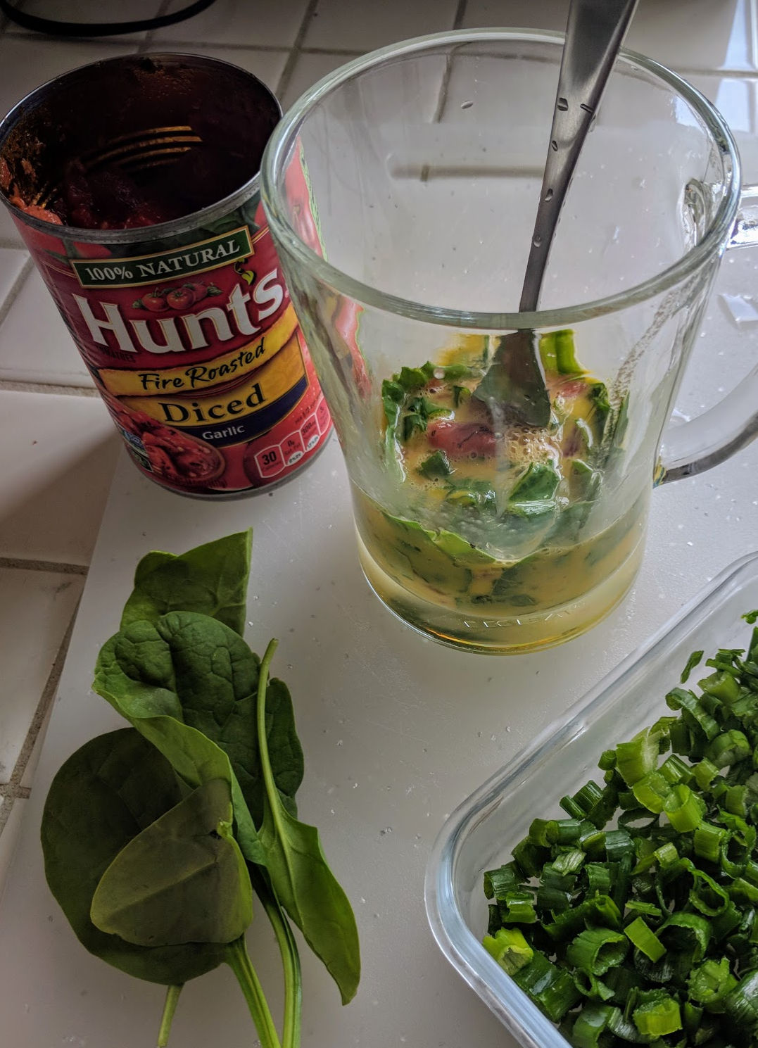 - Put some baby spinach, tomatoes, and green onions into the pan