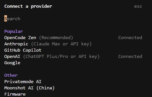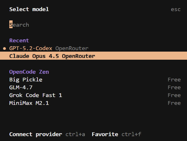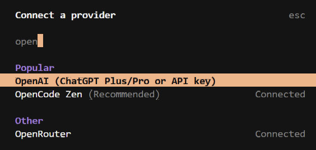 To use OpenCode, you need to connect to a model. You can use the OpenRouter API with OpenCode to easily switch between models like Claude, Gemini, and GTP Codex. However, you’ll have to buy and pay with credits. A cheaper solution is to use a ChatGPT Plus subscription, which is what I’ve been doing.