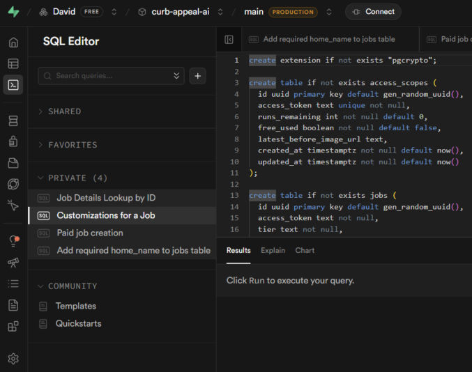 On your computer, create a folder for your project, e.g., curb-appeal-ai. Add the SQL script to it in a folder called “sql”, e.g., curb-appeal-ai/schema/001_init.sql